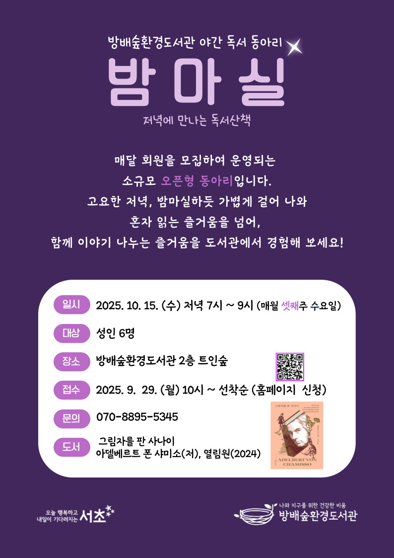[서초/문화예술] 방배숲환경도서관 ‘10월 밤마실: 저녁에 만나는 독서산책’ 모집 안내