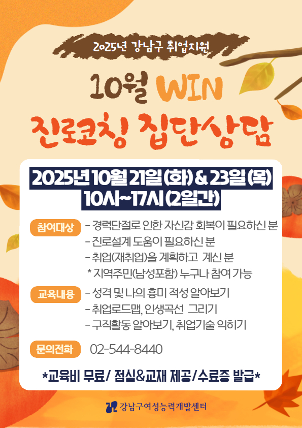 [강남/취업] 강남구여성능력개발센터 ‘10월 win 진로코칭 집단상담’ 모집 안내
